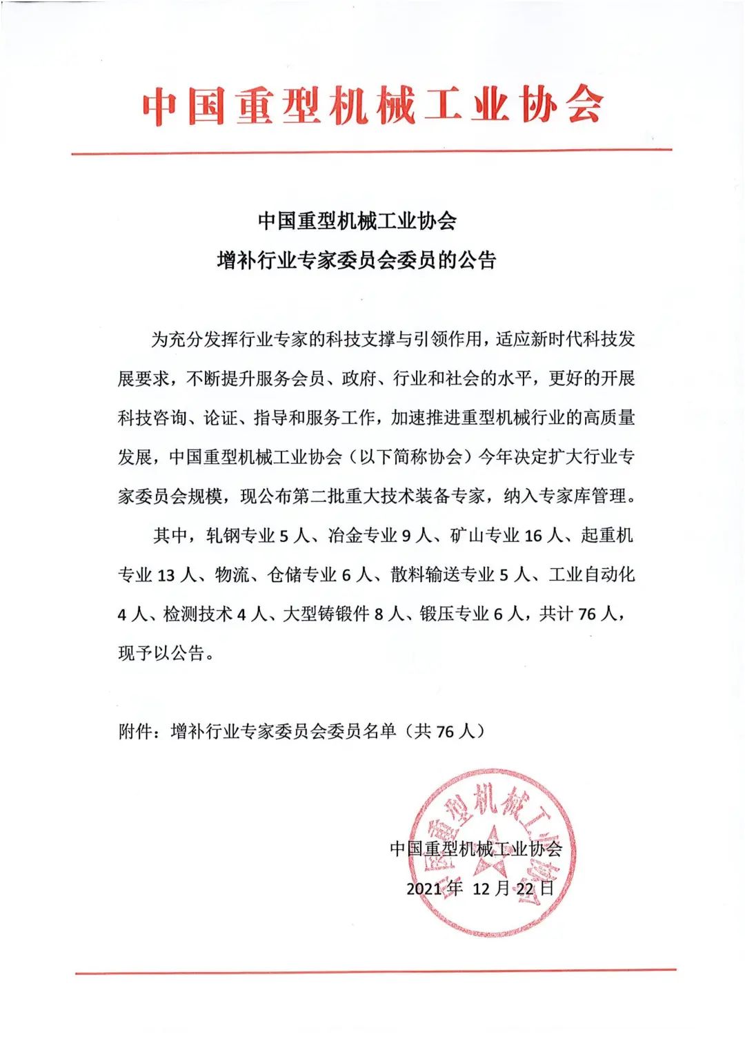 中國重型機械工業(yè)協(xié)會增補行業(yè)專家委員會委員的公告